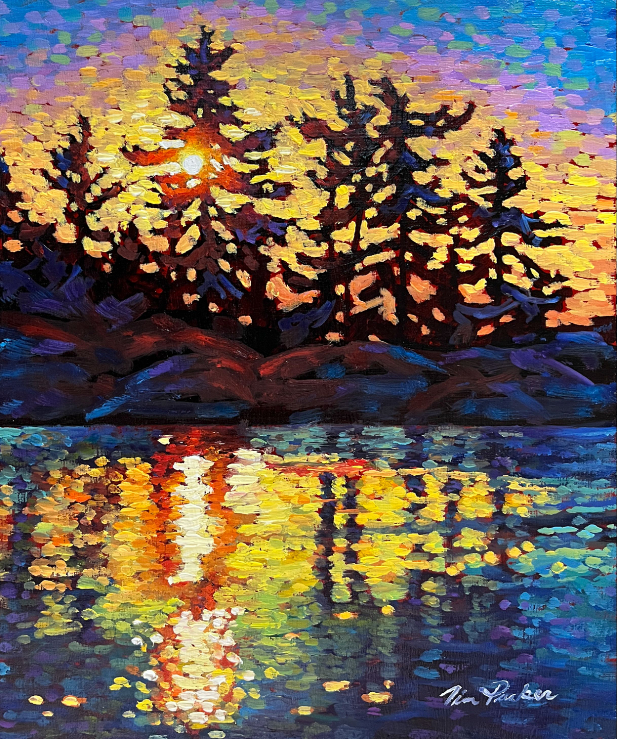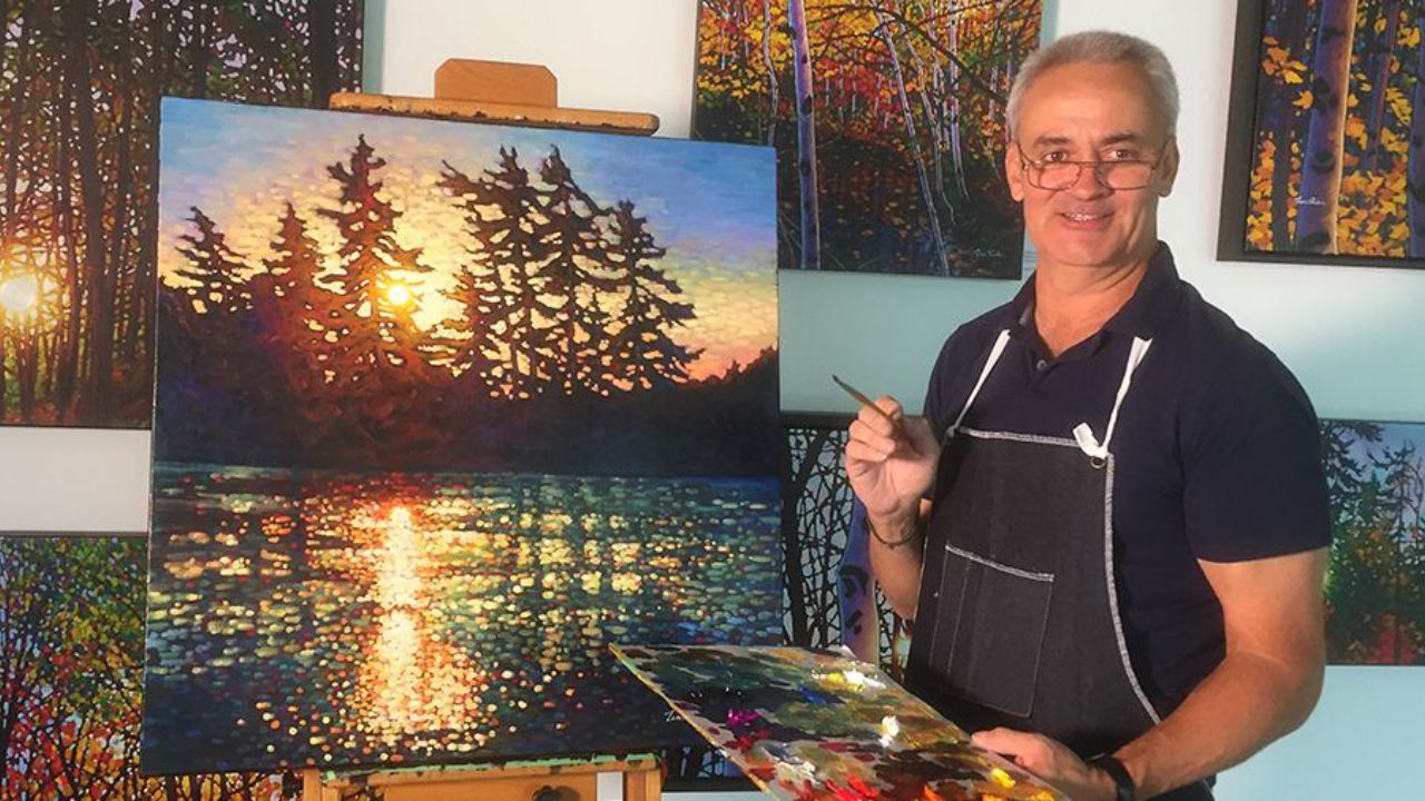 You’ll paint alongside Tim to create Batchewana Morning. A showstopping scene filled with shimmering water, glowing trees, a radiant sunset, and intricate negative shapes. The reflected light dances across the lake in broken colour, while the silhouetted trees and branches cut dramatic patterns into the sky and water.